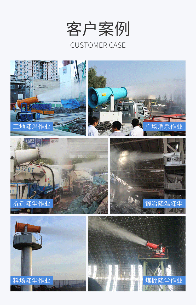 主要用途:適用于城市拆遷工地、冶金鋼鐵企業(yè)、采礦區(qū)域、煤化工企業(yè)、水泥廠、火力發(fā)電廠、建筑工地、物料和礦產(chǎn)品露天堆放廠、混凝土處理廠、垃圾堆放場、垃圾焚燒廠、沙廠、干式物料倉庫、露天爆破區(qū)域。
