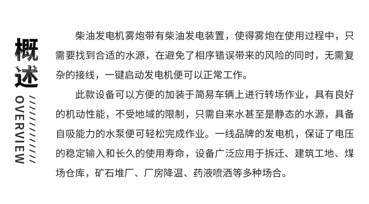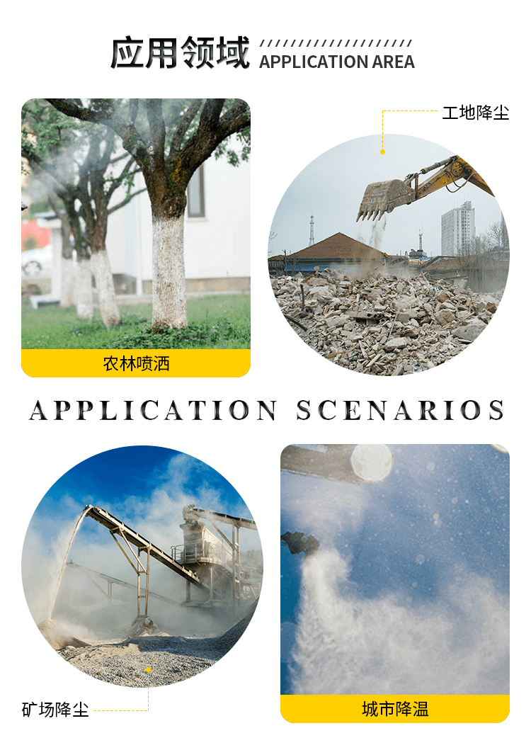 主要用途:建筑工地 煤場,礦場、料場、碼頭工業(yè)除塵,農(nóng)業(yè),園林綠化等飛機(jī)場、高速公路、車站、碼頭、公共場所、運(yùn)動(dòng)場地、炎熱場地等降塵保濕降溫消毒。