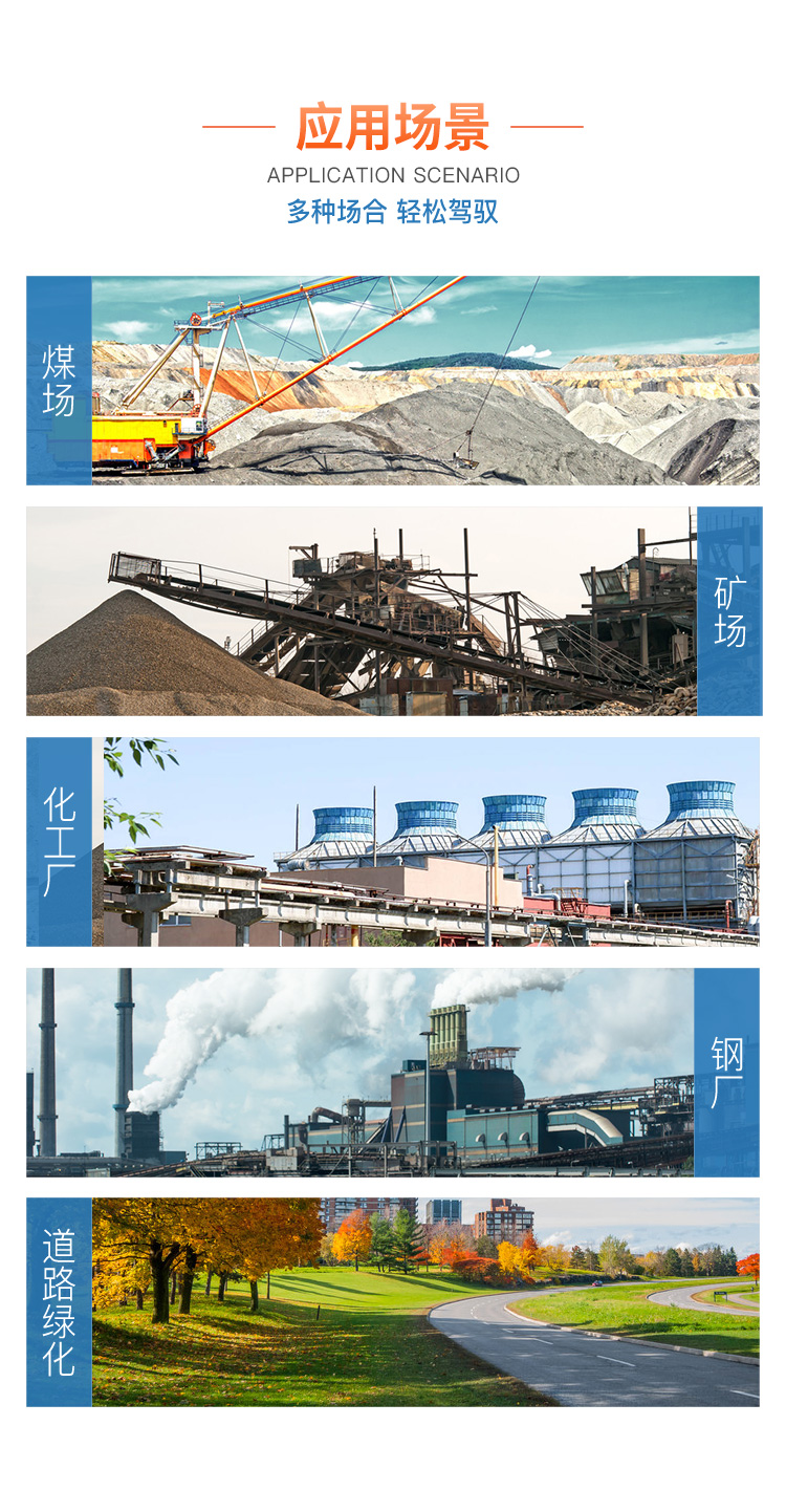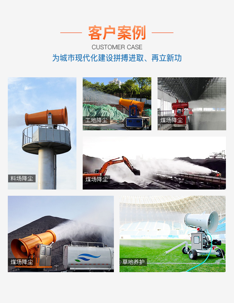 主要用途:建筑工地 煤場(chǎng),工業(yè)除塵,農(nóng)業(yè),園林綠化等飛機(jī)場(chǎng)、高速公路、車站、碼頭、公共場(chǎng)所、運(yùn)動(dòng)場(chǎng)地、炎熱場(chǎng)地等降塵保濕降溫消毒。