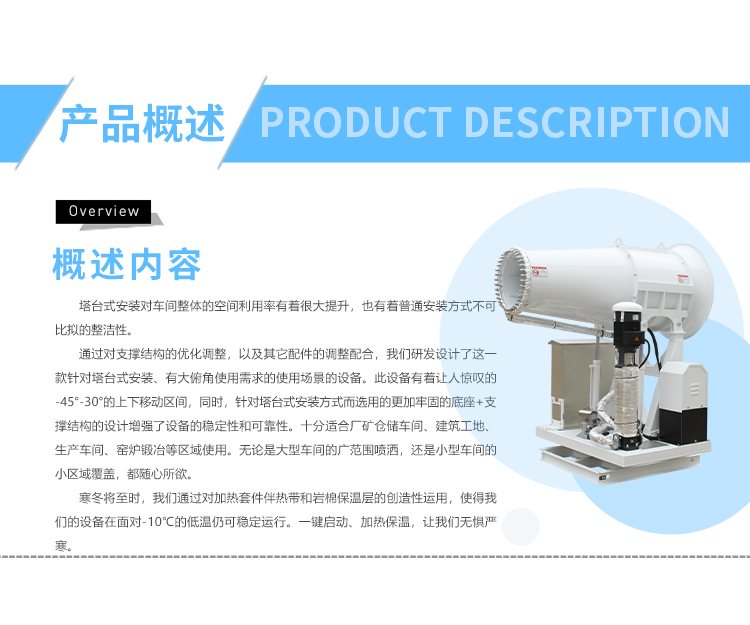 產(chǎn)品特點:60米塔臺式大仰角霧炮機(jī)有著讓人驚嘆的-45-30度的上下移動區(qū)間,同時,針對塔臺式安裝方式而確定的更加牢固的底座+支撐結(jié)構(gòu)的設(shè)計增強(qiáng)了設(shè)備的穩(wěn)定性和可靠性。