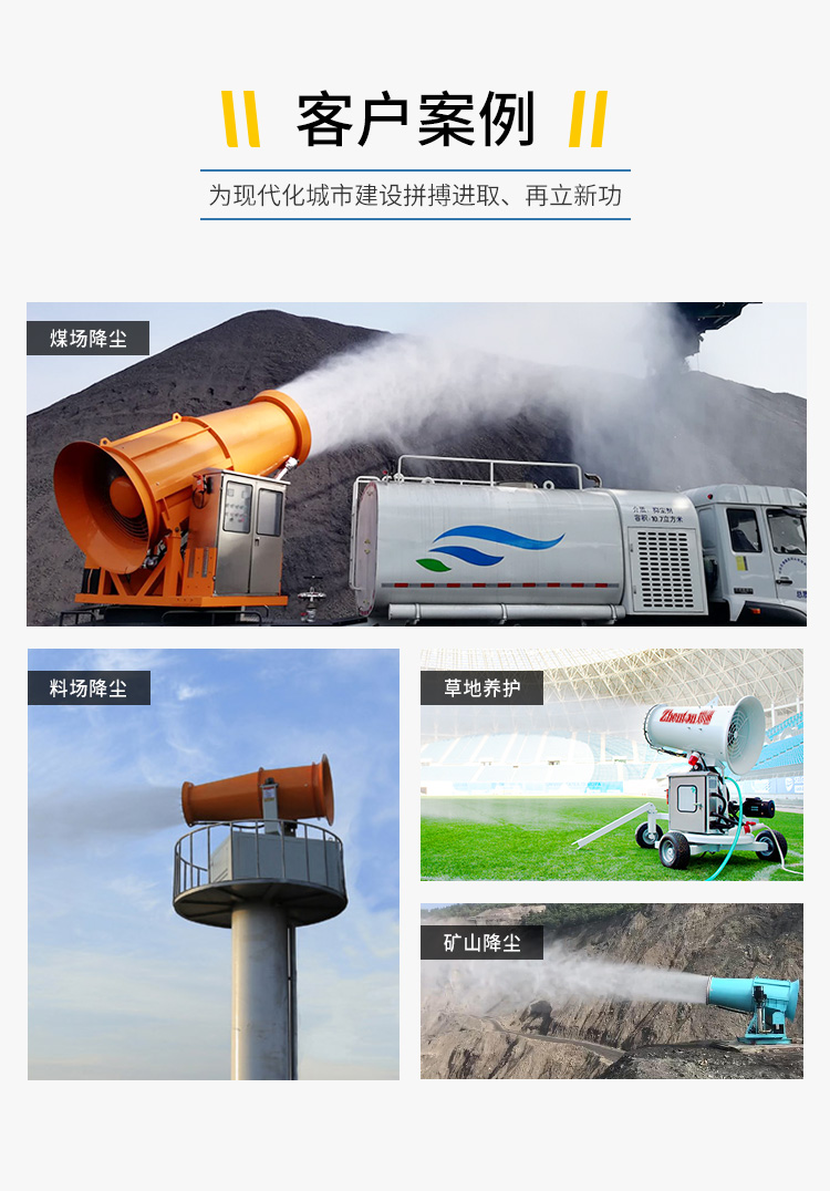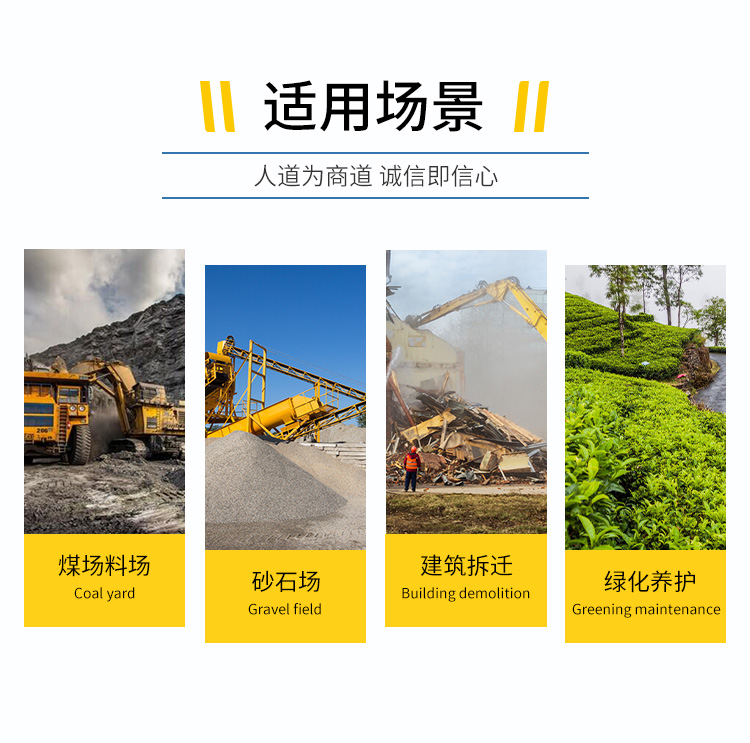 主要用途:用于煤礦場、城市拆遷工地、冶金鋼鐵企業(yè)、采礦區(qū)域、煤化工企業(yè)、水泥廠、火力發(fā)電廠、物料和礦產(chǎn)品露天堆放廠、混凝土處理廠、垃圾堆放場、垃圾焚燒廠、沙廠、干式物料倉庫、露天爆破、重度粉塵區(qū)域。