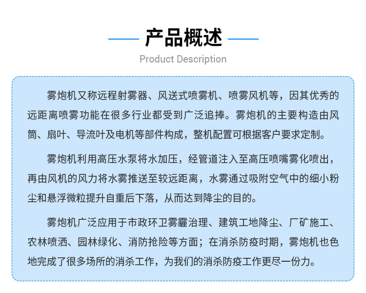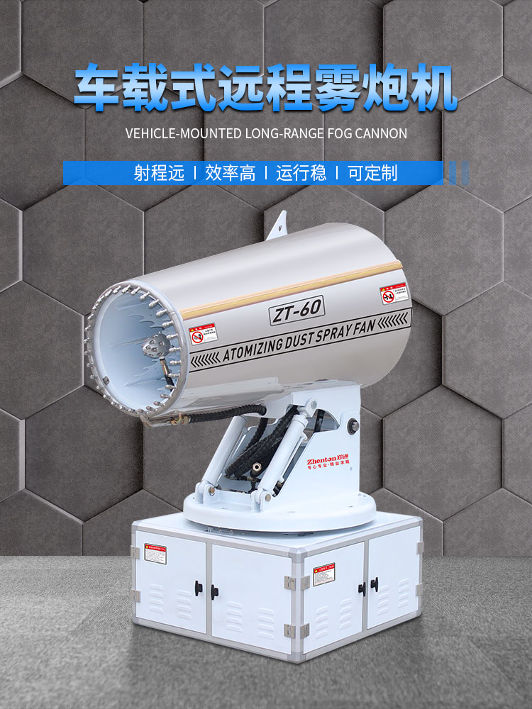 產(chǎn)品特點:60米遠程霧炮機具有結(jié)構(gòu)緊湊,穩(wěn)固可靠,整體高度低,噴霧距離遠,綜合性能優(yōu)越等特點。