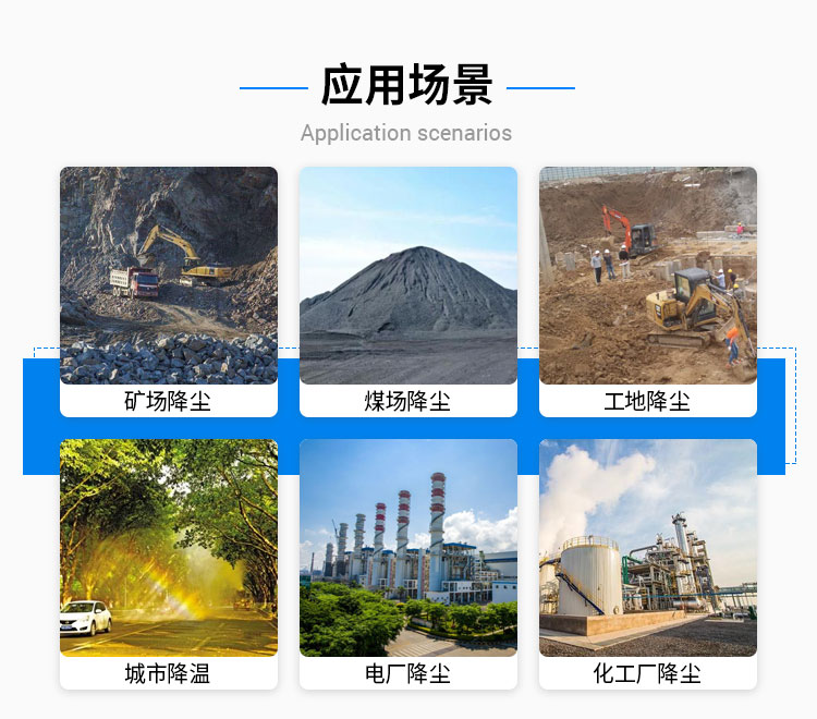 主要用途:用于城市拆遷工地、冶金鋼鐵企業(yè)、采礦區(qū)域、煤化工企業(yè)、水泥廠、火力發(fā)電廠、建筑工地、物料和礦產(chǎn)品露天堆放廠、混凝土處理廠、垃圾堆放場、垃圾焚燒廠、沙廠、干式物料倉庫、露天爆破、重度粉塵區(qū)域。