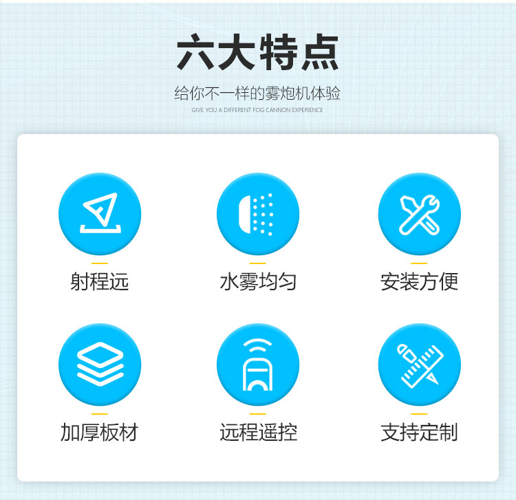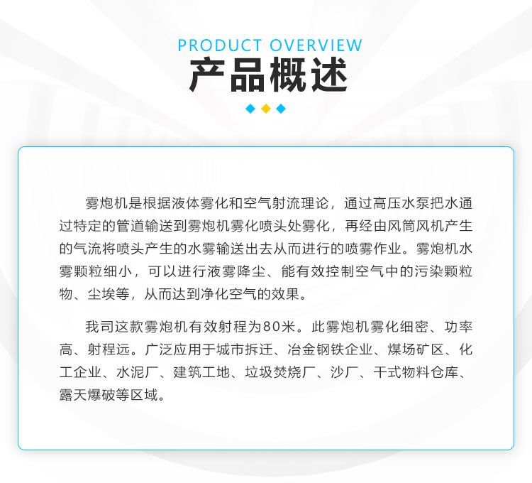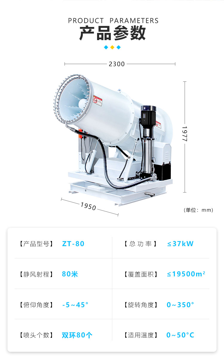 產(chǎn)品特點:80米降塵霧炮機射程遠、覆蓋范圍廣;多角度調(diào)節(jié)、無水珠全程霧引、安裝方式靈活多變。