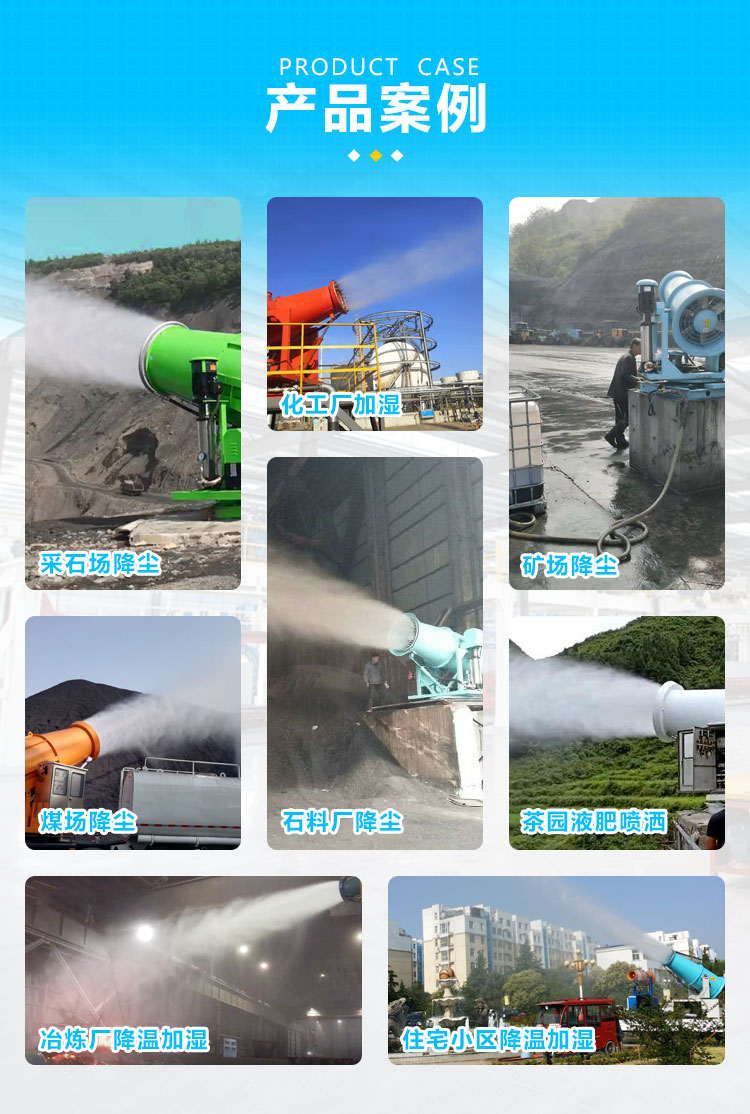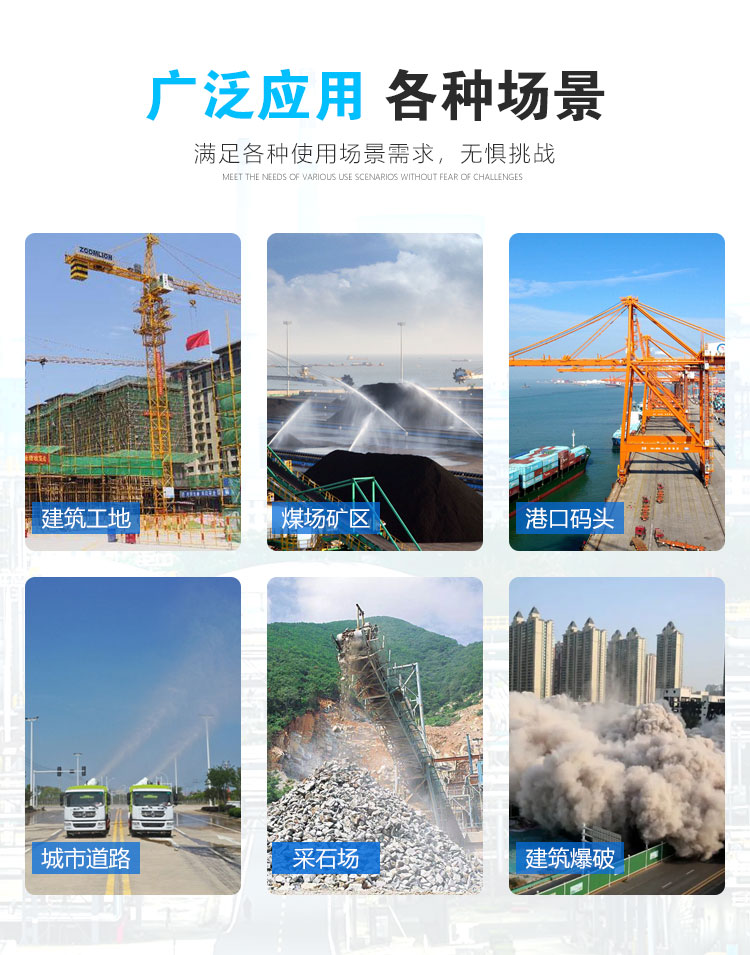 主要用途:用于煤礦場、城市拆遷工地、冶金鋼鐵企業(yè)、采礦區(qū)域、煤化工企業(yè)、水泥廠、火力發(fā)電廠、物料和礦產(chǎn)品露天堆放廠、混凝土處理廠、垃圾堆放場、垃圾焚燒廠、沙廠、干式物料倉庫、露天爆破、重度粉塵區(qū)域。