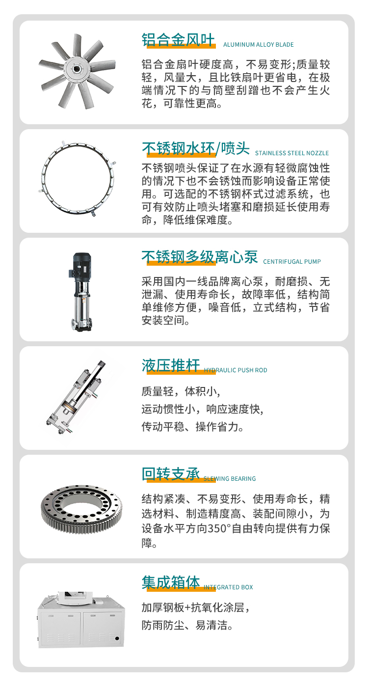 產(chǎn)品特點:工業(yè)降塵霧炮機顧名思義霧炮機主要的用途就是用來降塵,設備通過噴灑出直徑與灰塵直徑相近的微小霧粒并與空氣中的灰塵直接接觸,使得灰塵濕潤后通過吸附作用與周圍的灰塵凝結(jié)成團,再通過重力的作用使灰塵下沉,從而達到抑塵的效果。