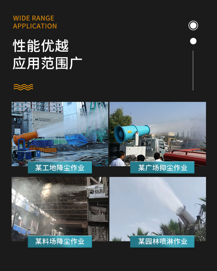 主要用途:用于煤礦場、城市拆遷工地、冶金鋼鐵企業(yè)、采礦區(qū)域、煤化工企業(yè)、水泥廠、火力發(fā)電廠、物料和礦產(chǎn)品露天堆放廠、混凝土處理廠、垃圾堆放場、垃圾焚燒廠、沙廠、干式物料倉庫、露天爆破、重度粉塵區(qū)域。