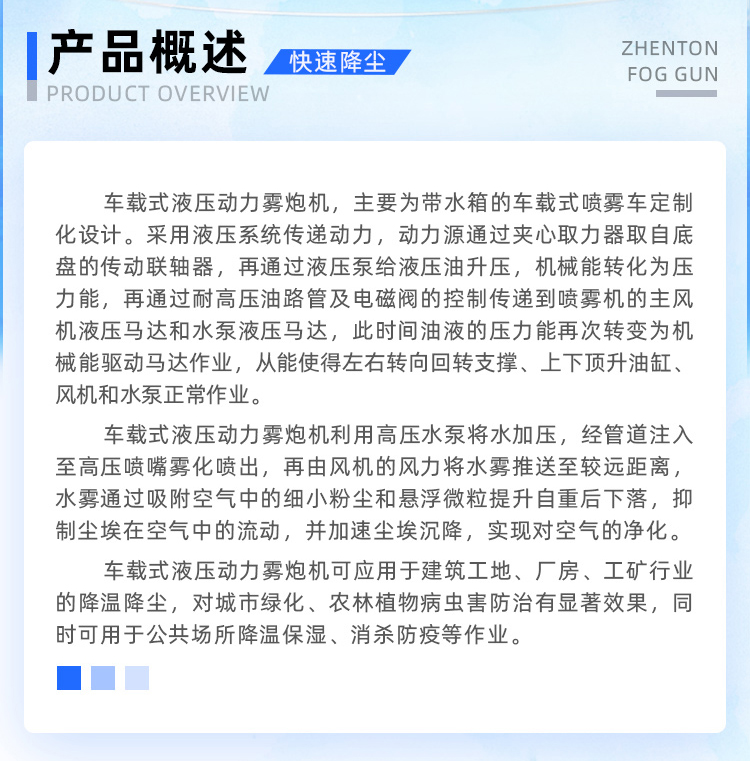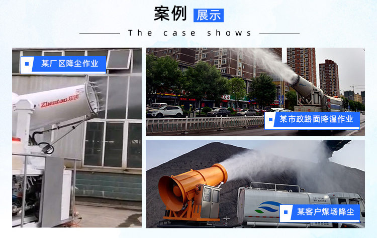 主要用途:用于煤礦場、城市拆遷工地、冶金鋼鐵企業(yè)、采礦區(qū)域、煤化工企業(yè)、水泥廠、火力發(fā)電廠、物料和礦產(chǎn)品露天堆放廠、混凝土處理廠、垃圾堆放場、垃圾焚燒廠、沙廠、干式物料倉庫、露天爆破、重度粉塵區(qū)域。
