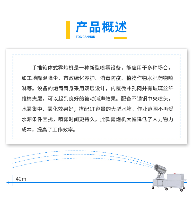 產(chǎn)品特點(diǎn):手推箱體式霧炮機(jī)配備不銹鋼中央噴頭,水霧集中、霧化效果好;搭配1T容量的大型水箱,作業(yè)范圍不再受水源條件困擾,噴霧時(shí)間更持久。