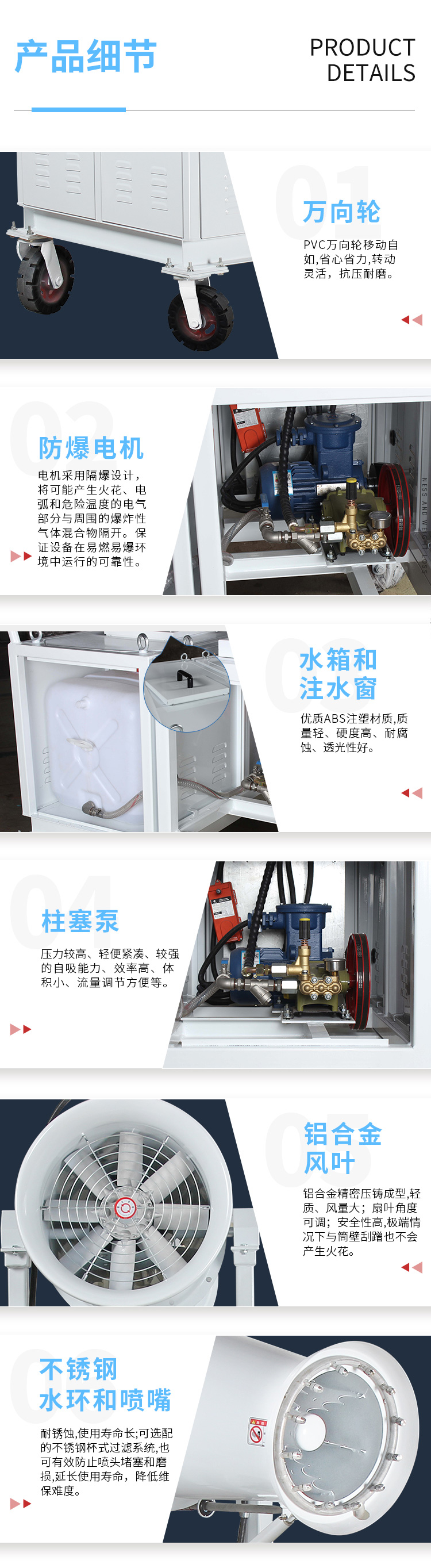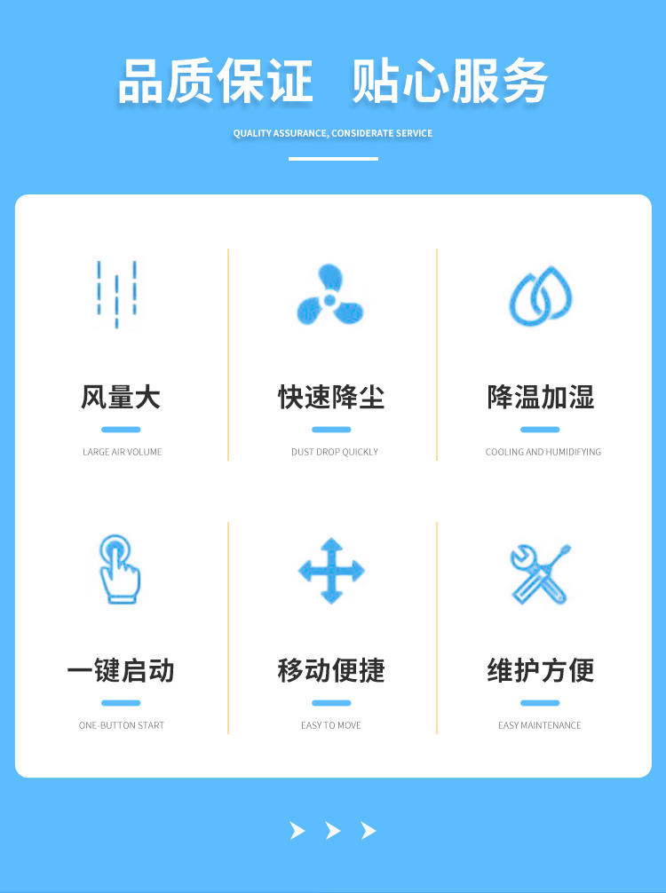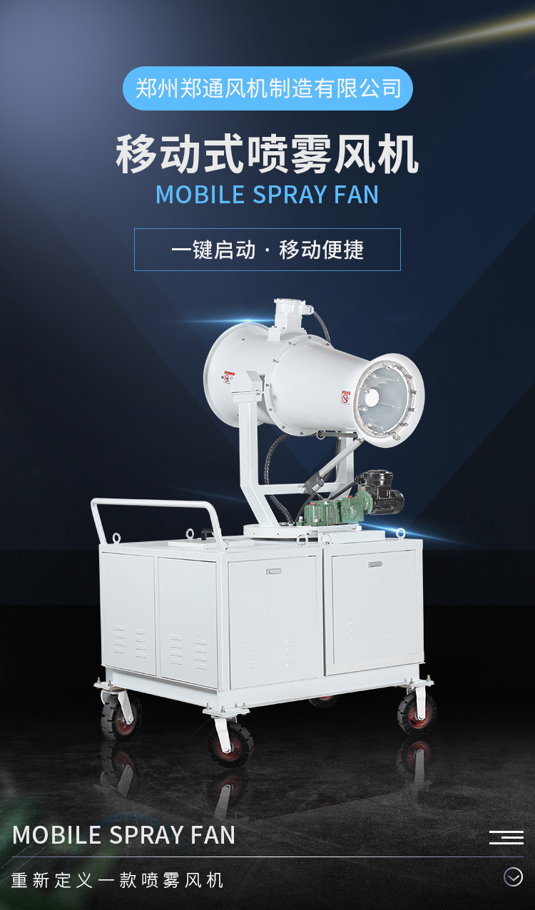 產(chǎn)品特點(diǎn):移動(dòng)式噴霧風(fēng)機(jī)這款產(chǎn)品具有一鍵啟動(dòng)功能,能起到快速降塵、降溫的作用;移動(dòng)便捷,方便維修。