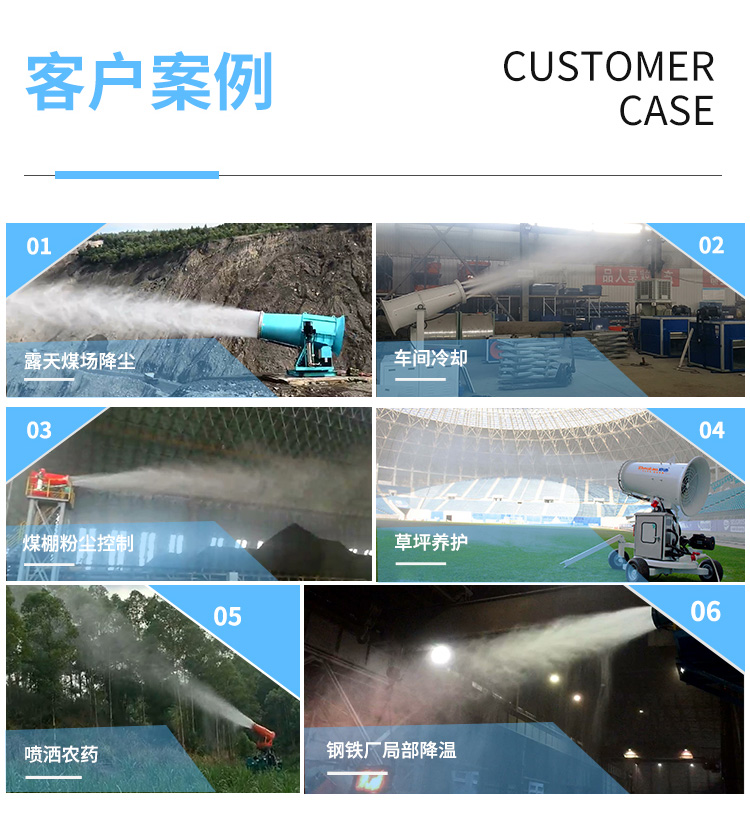 主要用途:適用于城市拆遷工地、冶金鋼鐵企業(yè)、采礦區(qū)域、煤化工企業(yè)、水泥廠、火力發(fā)電廠、建筑工地、物料和礦產(chǎn)品露天堆放廠、混凝土處理廠、垃圾堆放場(chǎng)、垃圾焚燒廠、沙廠、干式物料倉(cāng)庫(kù)、露天爆破、重度粉塵區(qū)域。