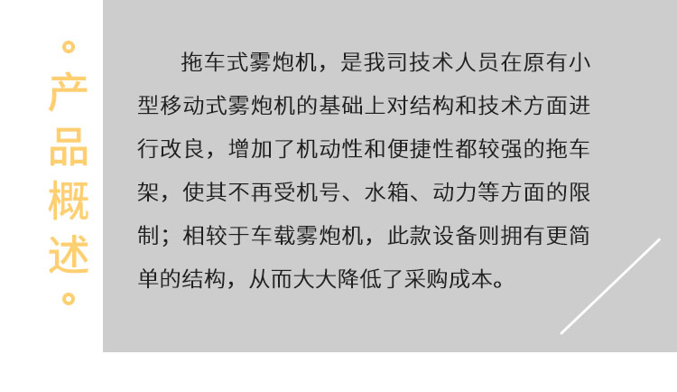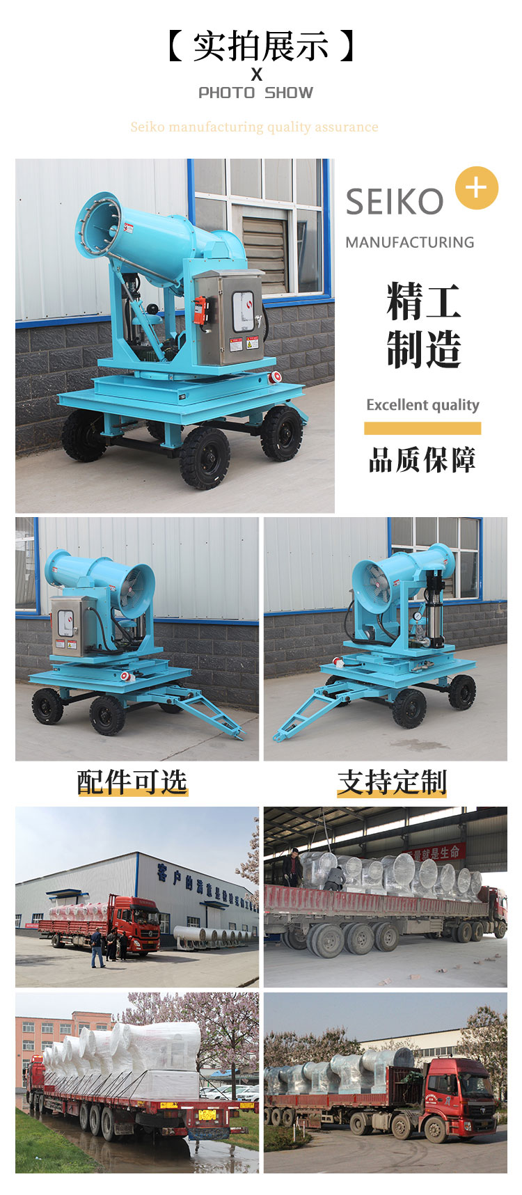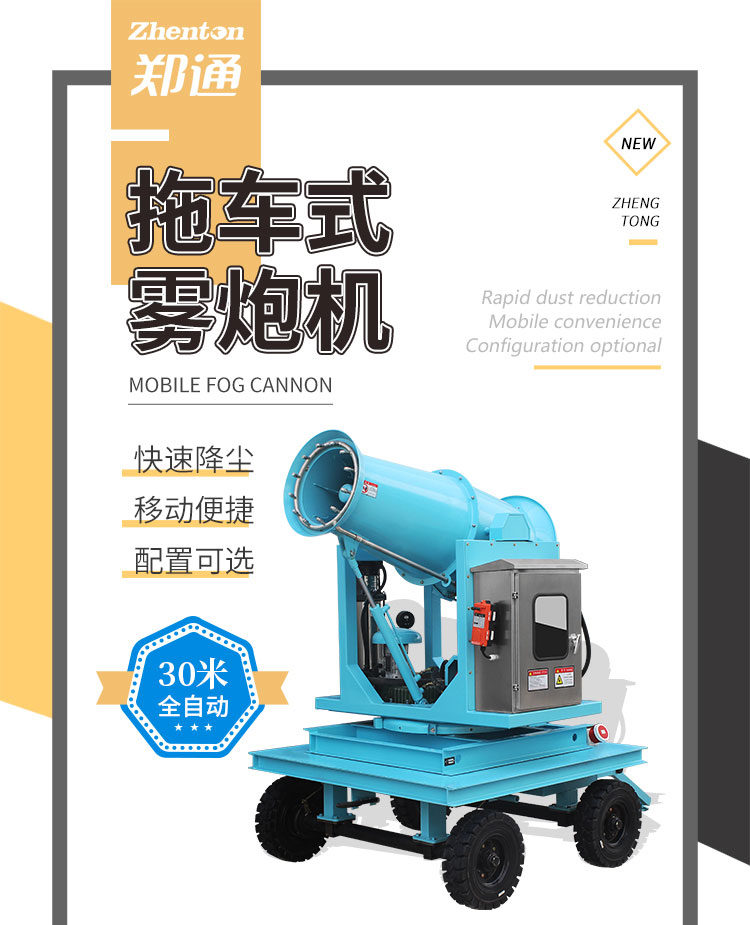 產(chǎn)品特點:拖車式霧炮機(jī)采用四輪牽引設(shè)計,移動便捷、射程遠(yuǎn)、覆蓋范圍廣,可在多種特殊環(huán)境使用。