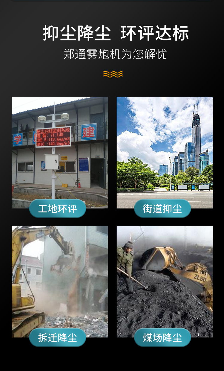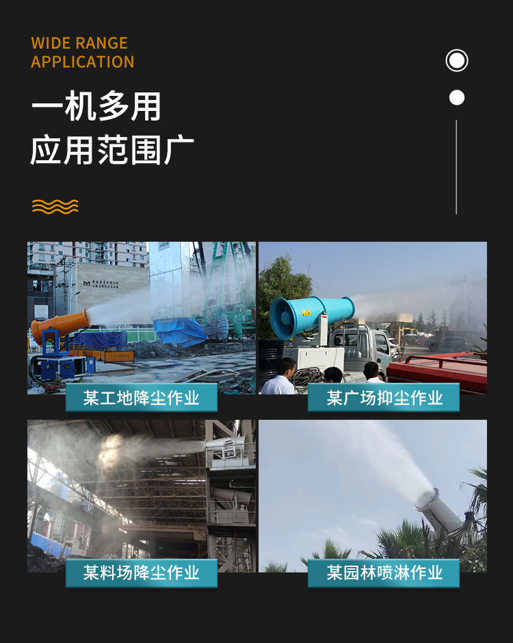 主要用途:用于城市拆遷工地、冶金鋼鐵企業(yè)、采礦區(qū)域、煤化工企業(yè)、水泥廠、火力發(fā)電廠、建筑工地、物料和礦產品露天堆放廠、混凝土處理廠、垃圾堆放場、垃圾焚燒廠、沙廠、干式物料倉庫、露天爆破、重度粉塵區(qū)域。