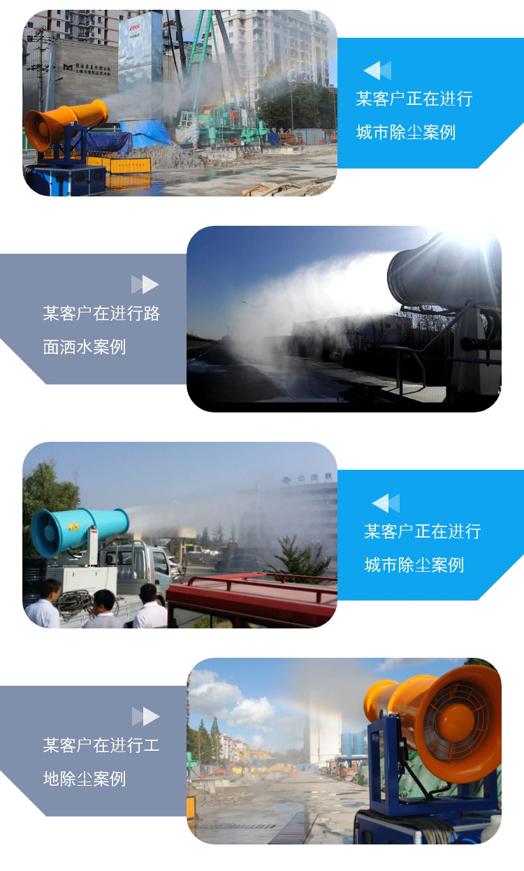 主要用途:用于煤礦場(chǎng)、城市拆遷工地、冶金鋼鐵企業(yè)、采礦區(qū)域、煤化工企業(yè)、水泥廠、火力發(fā)電廠、物料和礦產(chǎn)品露天堆放廠、混凝土處理廠、垃圾堆放場(chǎng)、垃圾焚燒廠、沙廠、干式物料倉庫、露天爆破、重度粉塵區(qū)域。