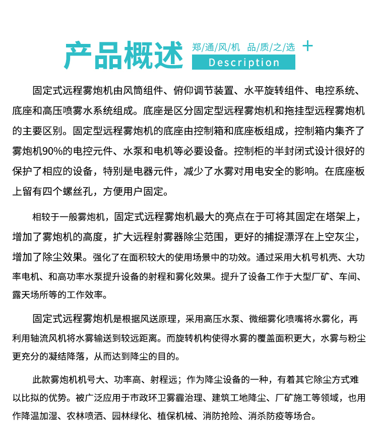 主要用途:用于煤礦場(chǎng)、城市拆遷工地、冶金鋼鐵企業(yè)、采礦區(qū)域、煤化工企業(yè)、水泥廠、火力發(fā)電廠、物料和礦產(chǎn)品露天堆放廠、混凝土處理廠、垃圾堆放場(chǎng)、垃圾焚燒廠、沙廠、干式物料倉(cāng)庫(kù)、露天爆破、重度粉塵區(qū)域。