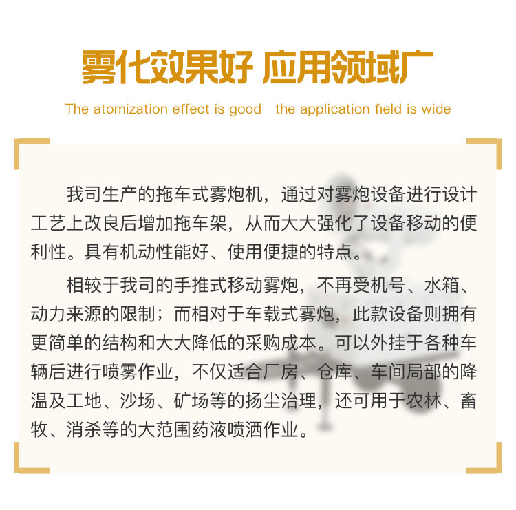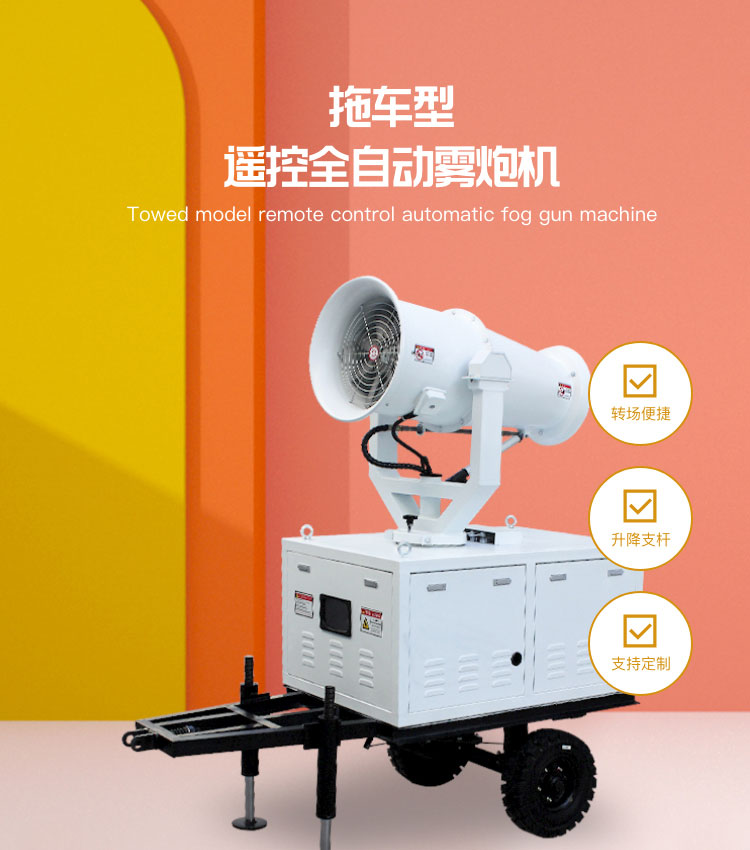 產(chǎn)品特點:拖車式遙控全自動霧炮機射程遠、機動性能好、使用便捷,支持遙控和人工控制操作。