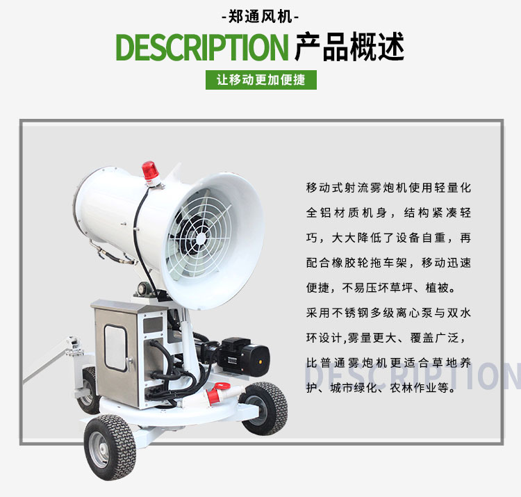 產品特點:草坪養(yǎng)護霧炮機使用輕量化全鋁材質機身,結構緊湊輕巧,大大降低了設備自重,再配合橡膠輪拖車架,移動迅速便捷,不易壓壞草坪、植被;采用不銹鋼多級離心泵與雙水環(huán)設計,霧量更大、覆蓋廣泛。