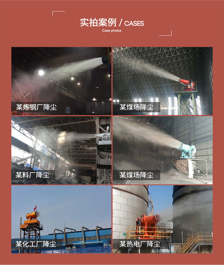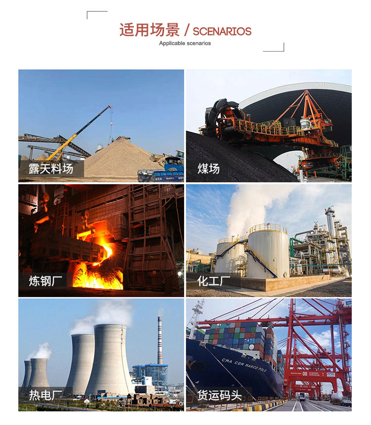 主要用途:用于煤礦場地、冶金鋼鐵企業(yè)、采礦區(qū)域、煤化工企業(yè)、水泥廠、火力發(fā)電廠、建筑工地、物料和礦產(chǎn)品露天堆放廠、混凝土處理廠、垃圾堆放場、垃圾焚燒廠、沙廠、干式物料倉庫、露天爆破、重度粉塵區(qū)域。