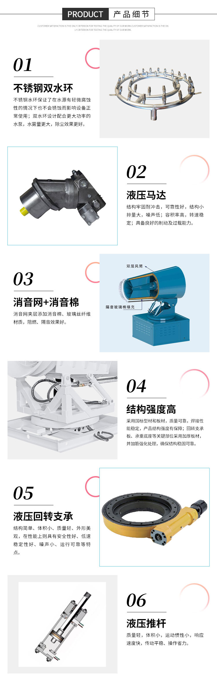產(chǎn)品特點:80米液壓霧炮機的炮筒筒身采用雙層設(shè)計,內(nèi)覆微沖孔網(wǎng)并有玻璃絲纖維棉夾層,可以起到良好的被動消聲效果。