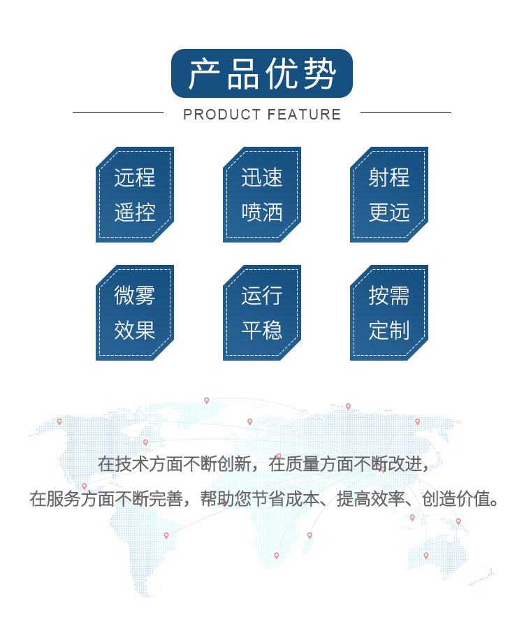 產(chǎn)品特點(diǎn):固定式遠(yuǎn)程霧炮機(jī)射程遠(yuǎn)、覆蓋范圍廣、工作效率高、可以實(shí)現(xiàn)精量噴霧;配套動(dòng)力靈活,使用安全可靠。
