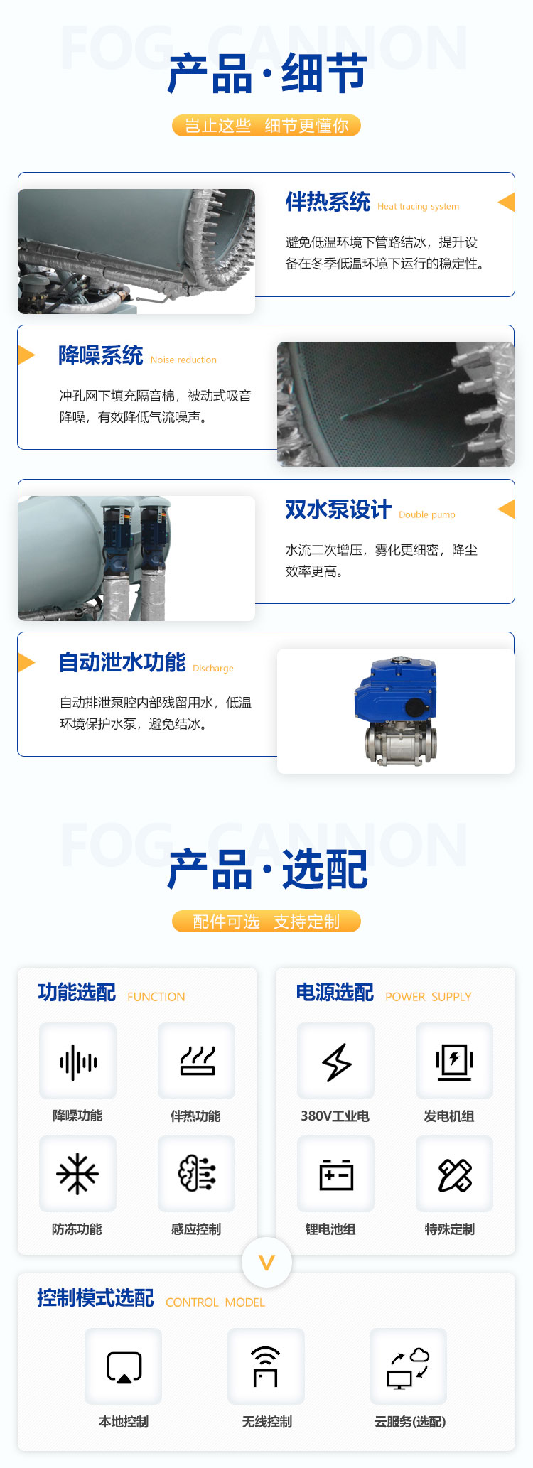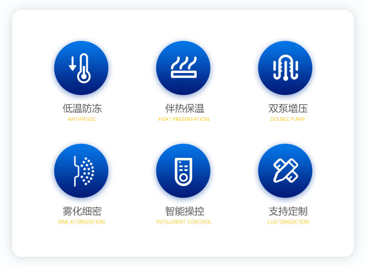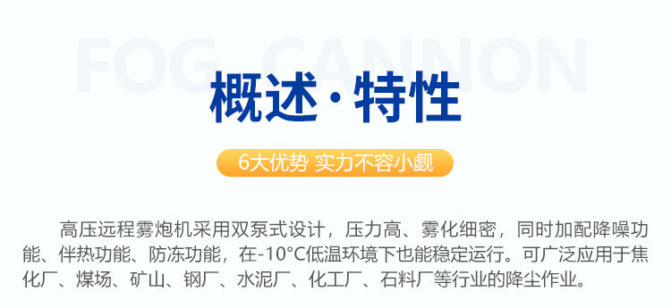 產(chǎn)品特點(diǎn):高壓遠(yuǎn)程霧炮機(jī)采用雙泵式設(shè)計(jì),壓力高、霧化細(xì)密,同時(shí)加配降噪功能、伴熱功能、防凍功能,在-10°C低溫環(huán)境下也能穩(wěn)定運(yùn)行。