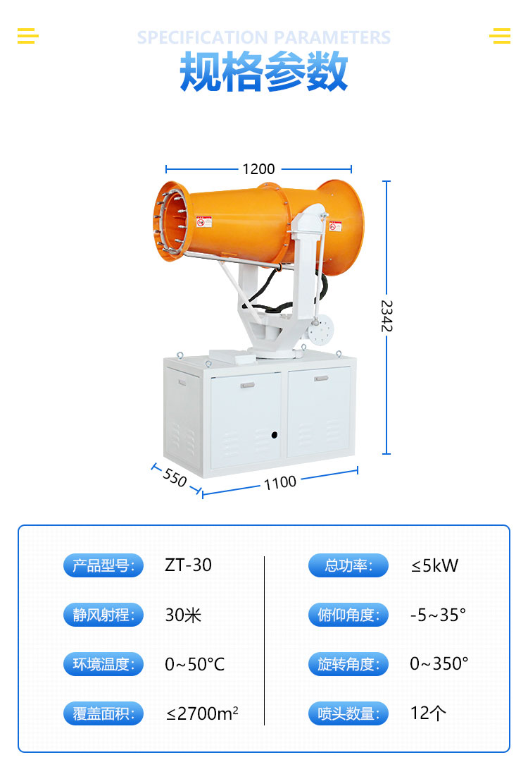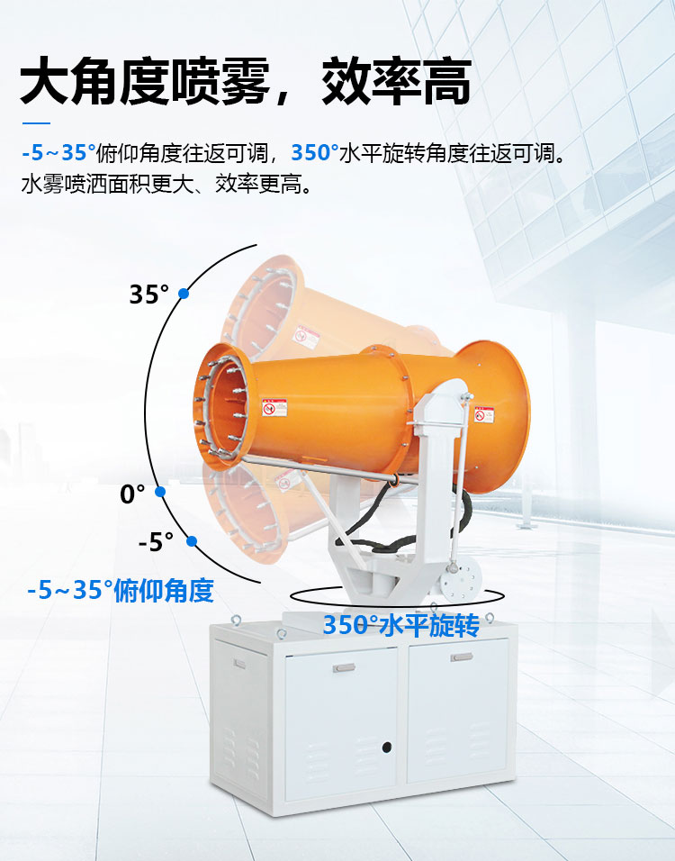 產(chǎn)品特點:車載式除塵霧炮機-5~35°俯仰角度往返可調,350°水平旋轉角度往返可調,水霧噴灑面積更大、效率更高。