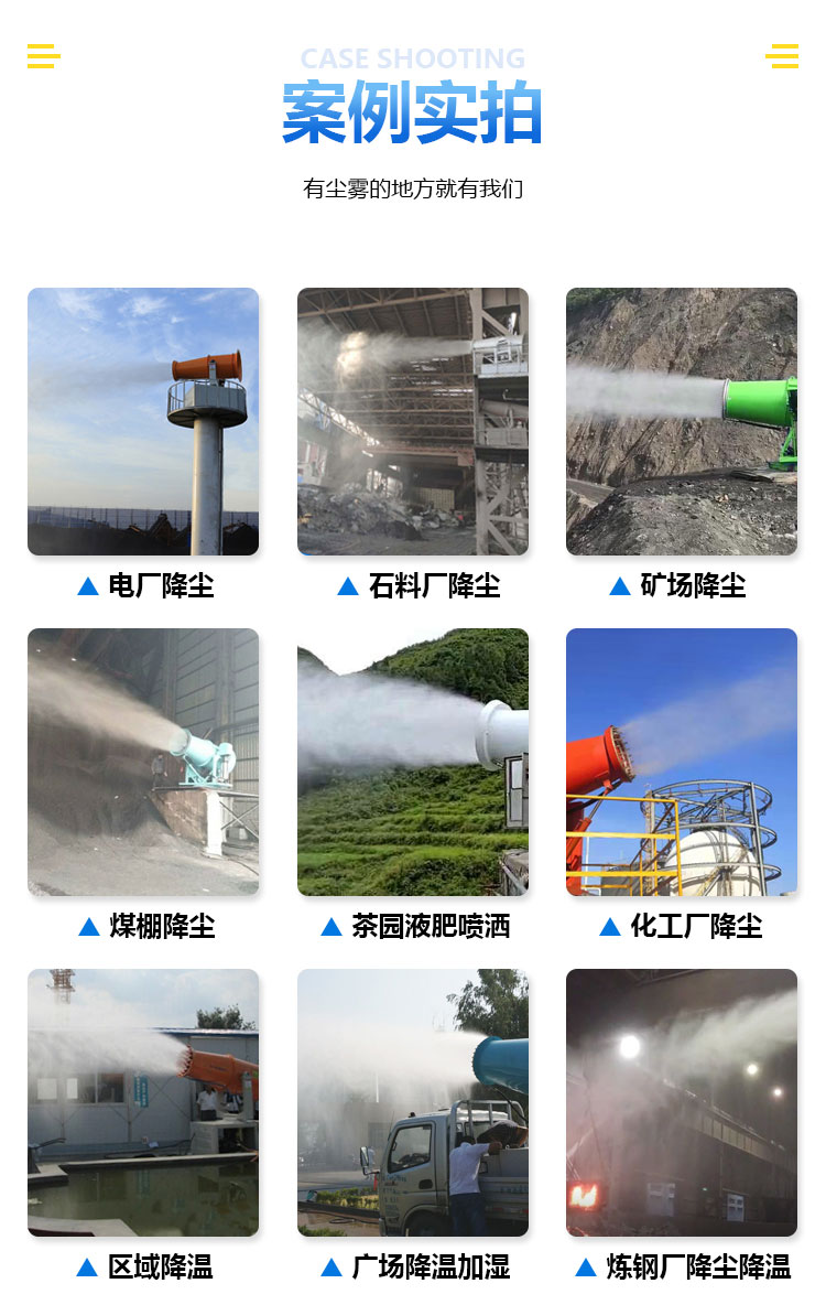 主要用途:適用于城市拆遷工地、冶金鋼鐵企業(yè)、采礦區(qū)域、煤化工企業(yè)、水泥廠、火力發(fā)電廠、建筑工地、物料和礦產(chǎn)品露天堆放廠、混凝土處理廠、垃圾堆放場、垃圾焚燒廠、沙廠、干式物料倉庫、露天爆破、重度粉塵區(qū)域。