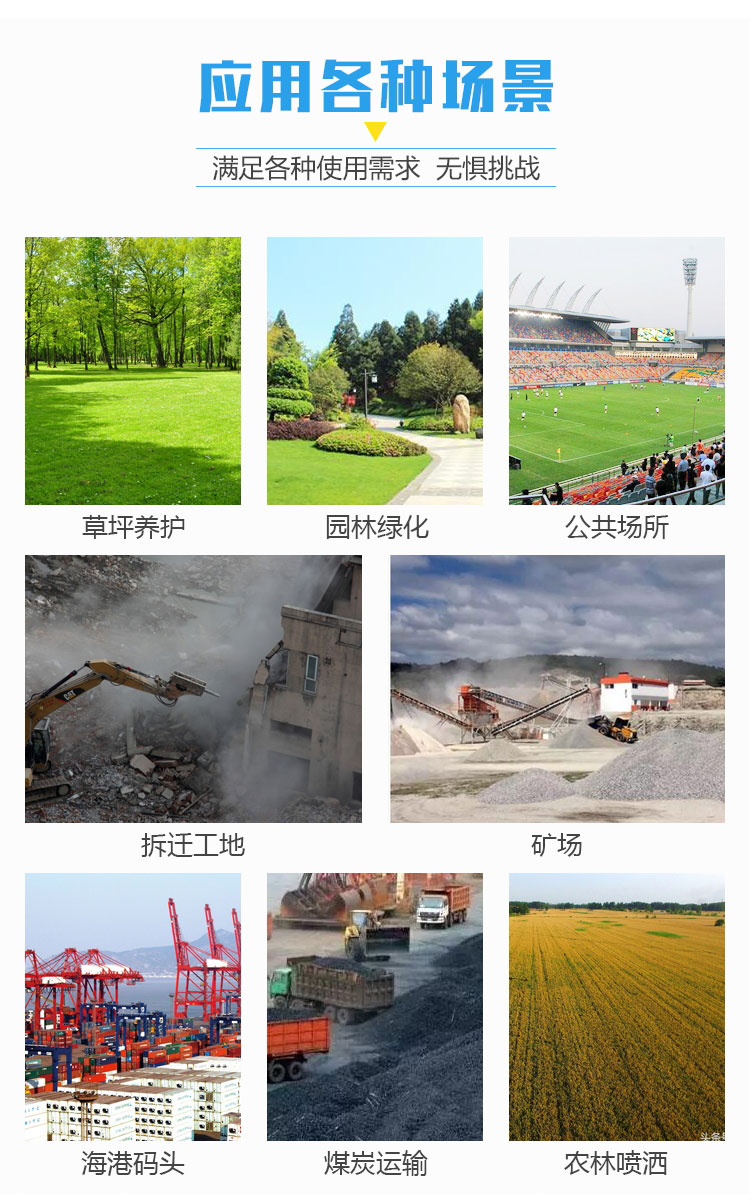 主要用途:城市拆遷工地、冶金鋼鐵企業(yè)、采礦區(qū)域、煤化工企業(yè)、水泥廠、火力發(fā)電廠、建筑工地、物料和礦產(chǎn)品露天堆放廠、混凝土處理廠、垃圾堆放場(chǎng)、垃圾焚燒廠、沙廠、干式物料倉庫、露天爆破、重度粉塵區(qū)域。