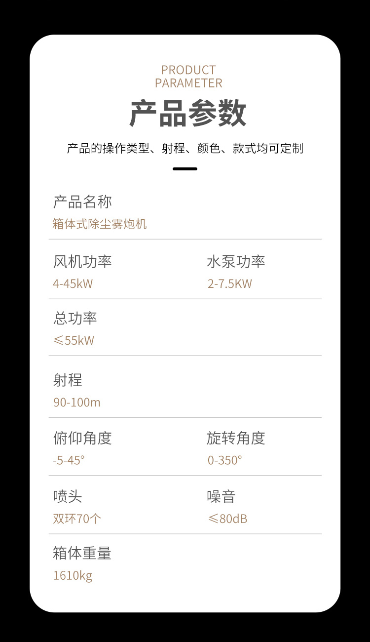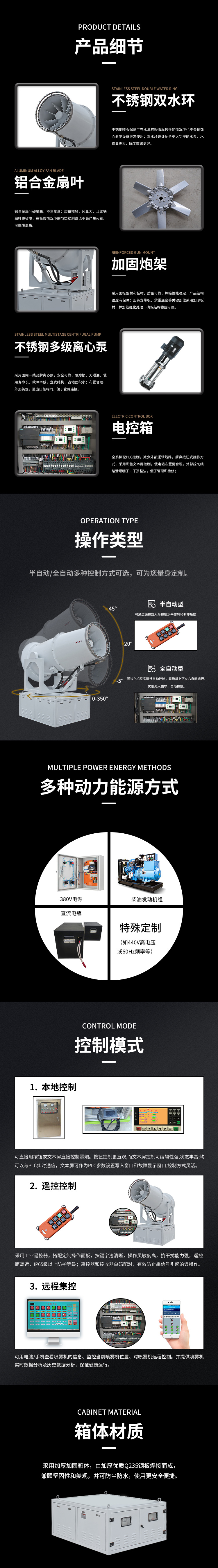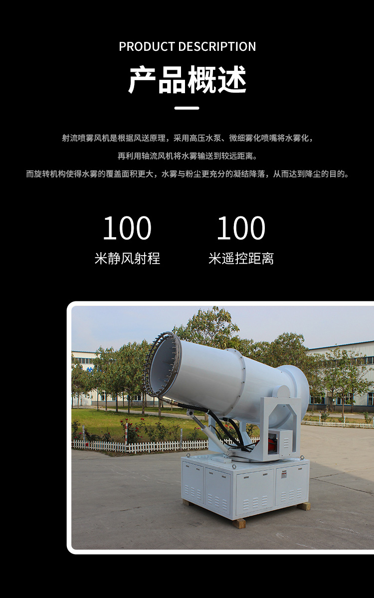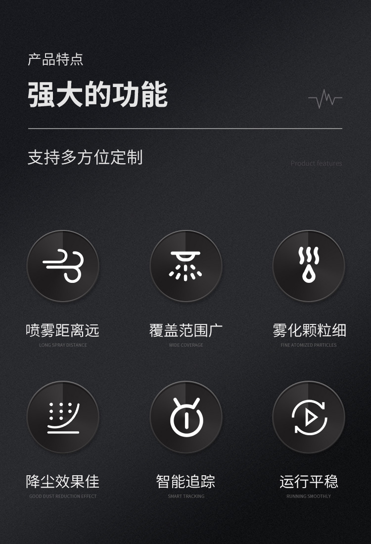 產(chǎn)品特點(diǎn):100米雙水箱霧炮機(jī)噴霧距離遠(yuǎn)、覆蓋范圍廣、霧化顆粒細(xì)、降塵效果佳、運(yùn)行平穩(wěn)使用安全可靠。