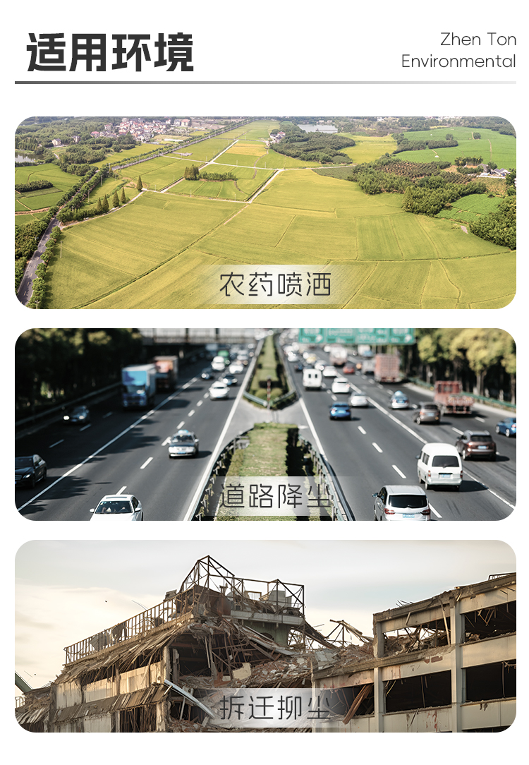 主要用途:適用于城市道路降塵、建筑工地、煤場、工業(yè)除塵、農(nóng)業(yè)和園林綠化等粉塵大場所。