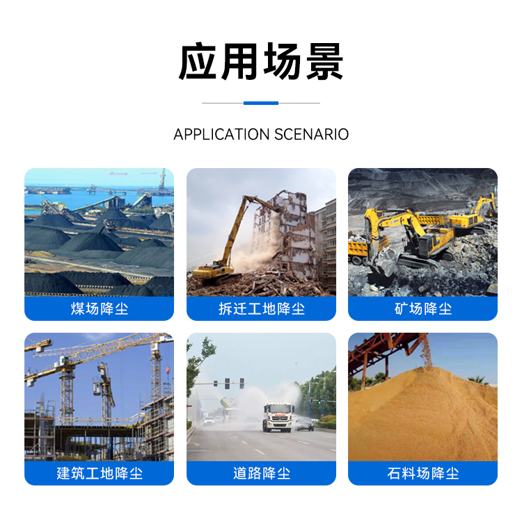 主要用途:工地降塵、石料廠、煤場、礦山、高鹽廢水處理、蒸發(fā)塘霧化、鋼廠等場景。