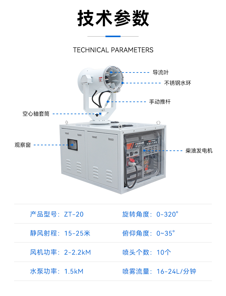 產(chǎn)品特點(diǎn):這款ZT-20型車載式柴油發(fā)電霧炮機(jī) ,其射程達(dá)20米,覆蓋范圍廣。它噴霧速度快、效率高,能快速降低空氣中的粉塵濃度。采用柴油發(fā)電機(jī)供電,靈活性強(qiáng),不受場地限制。配備遙控和手動控制操作,可隨意調(diào)節(jié)水平旋轉(zhuǎn)噴霧角度,使用安全可靠。