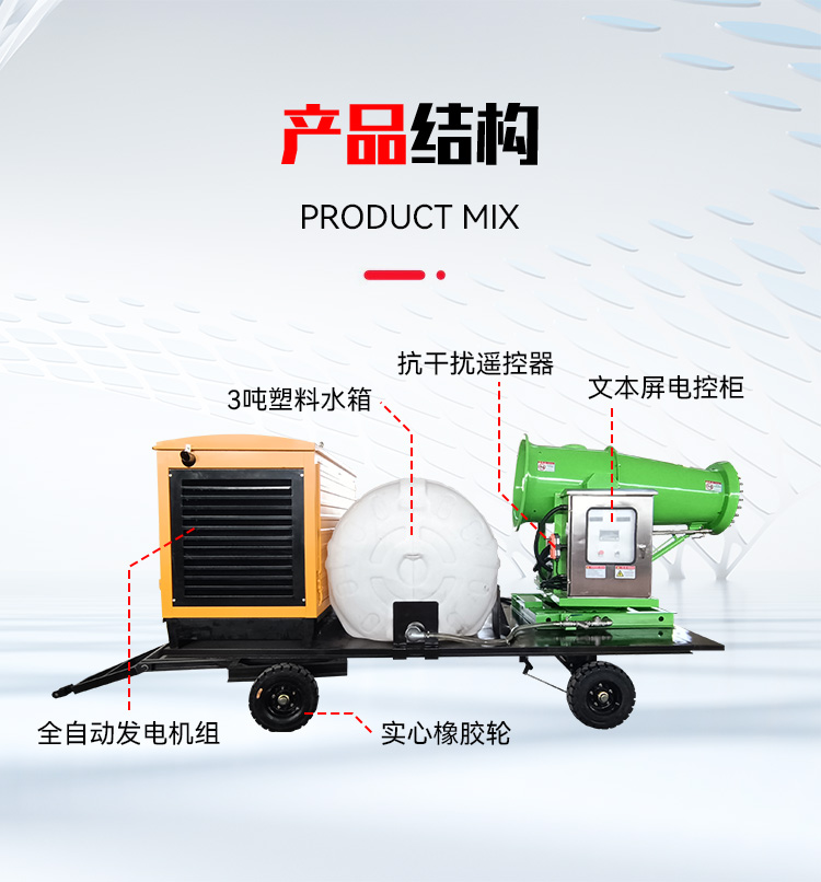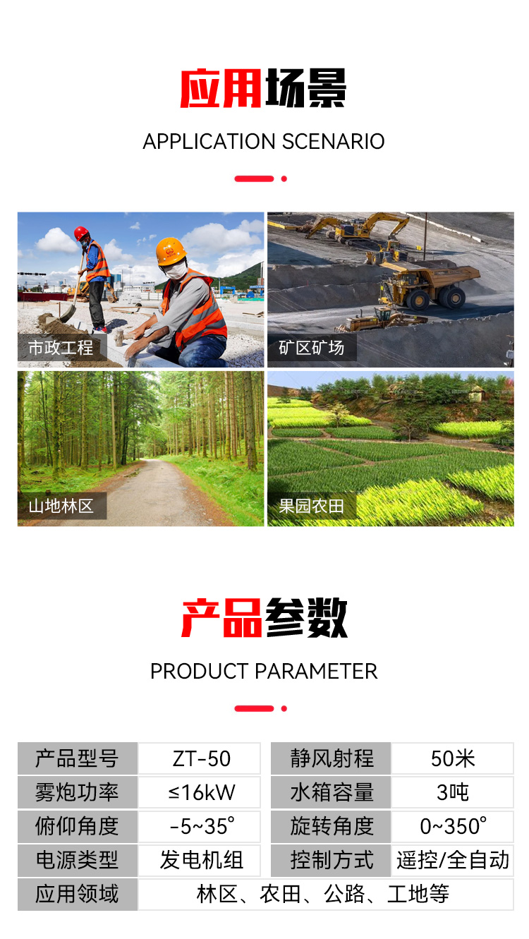 主要用途:果園農(nóng)田、建筑工地、礦山開采、港口碼頭、垃圾處理場(chǎng)、城市公共活動(dòng)等場(chǎng)景除塵降溫。