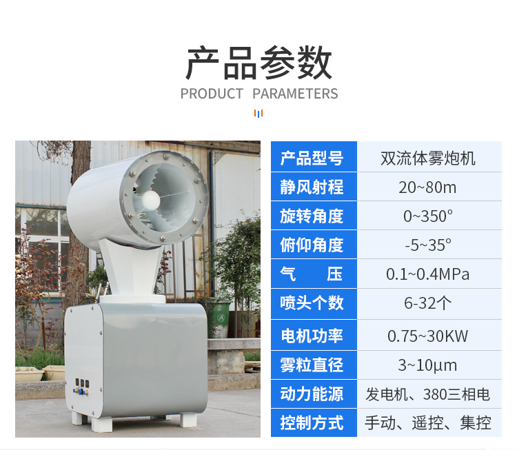 產(chǎn)品特點:雙流體干霧炮是一種先進(jìn)的噴霧設(shè)備,通過特殊設(shè)計的噴頭,將液體和壓縮空氣混合,形成微米級的細(xì)小霧滴,相比傳統(tǒng)的濕法噴霧,雙流體干霧炮使用的水量更少,且霧滴更細(xì)小,能夠減少水資源的浪費(fèi)。配備有電動或氣動驅(qū)動系統(tǒng),可以方便地調(diào)整噴霧角度、范圍和強(qiáng)度。
