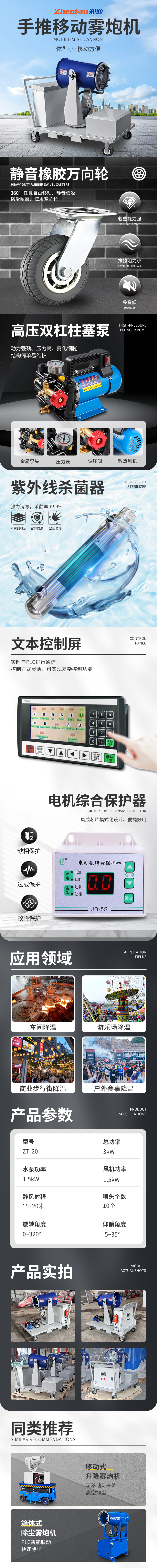 主要用途:可用于冷鏈物流倉儲噴霧消殺、廠房車間除塵降溫、游樂場降溫、室外場地降溫、施工工地降塵、鋼廠降塵、水泥原料車間降塵等。